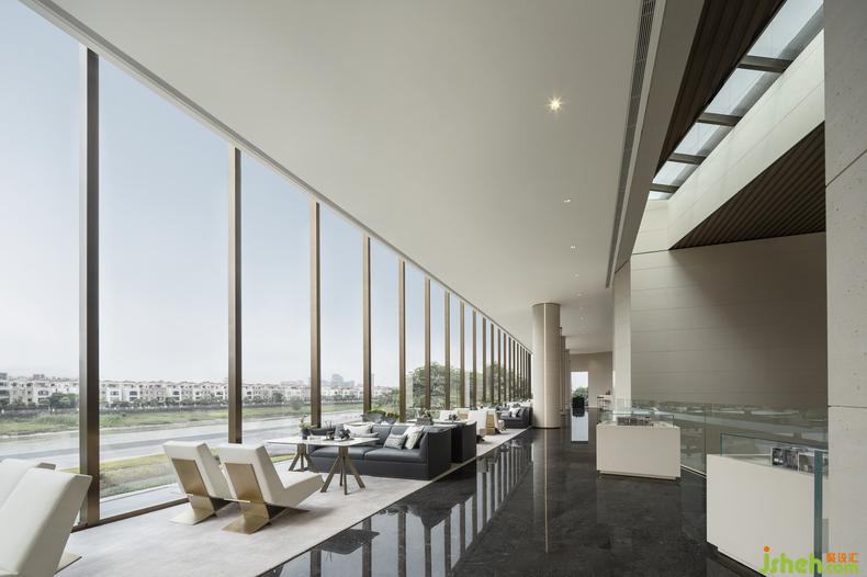 在空間布局與動線設(shè)計的考量上設(shè)計師貫徹了“流動空間”的設(shè)計理念,展示中心設(shè)計水吧與洽談區(qū)空間相互滲透,蜿蜒曲折的天花燈帶,林立安靜的軟裝陳設(shè)與美景交相呼應(yīng),簡單的色彩處理在光線對照中安靜而充滿變化,為社交宴席提供了良好的氛圍。