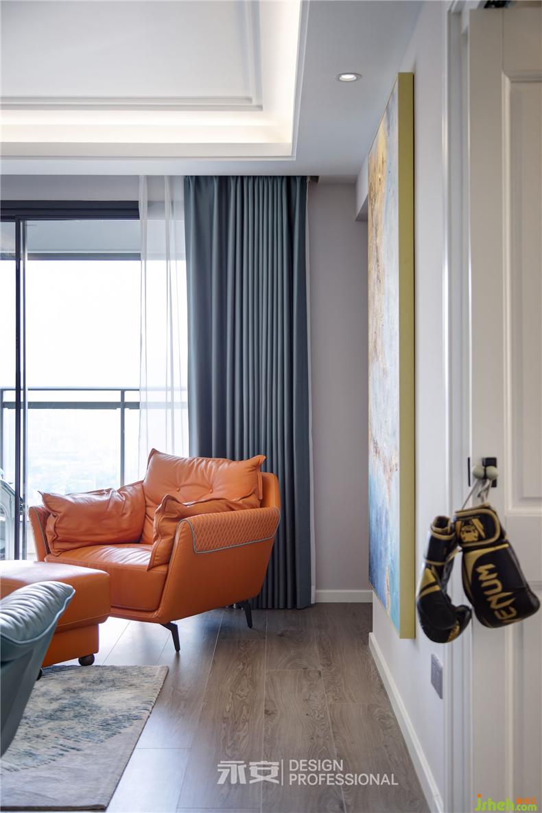 橘黃色和淺藍色的法式沙發(fā)松軟舒適,二者之間雖然色度跨度較大,但通過主題裝飾畫的映襯,室內(nèi)設(shè)計師明悅而又自然地從空間視野中跳躍出來,營造出都市生活的居家愜意