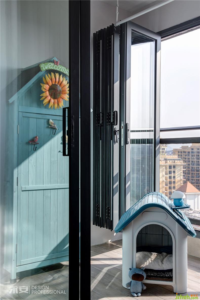 陽(yáng)臺(tái)的視線開(kāi)闊明朗,落地推拉門(mén)的設(shè)計(jì)讓陽(yáng)光、空氣、微風(fēng)等自然元素能夠通暢地傳遞到室內(nèi)。陽(yáng)臺(tái)左側(cè)是泰迪可愛(ài)的小屋子跟寵物柜,屋頂和柜面涂料都采用了輕松愉悅的蔚藍(lán)色,隱約間與客廳內(nèi)的幾抹淺藍(lán)以及窗外的藍(lán)天白云形成跳躍式的關(guān)聯(lián)