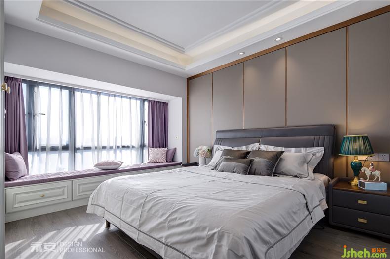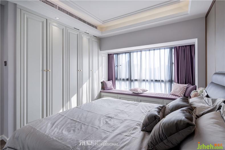 一扇可以?xún)扇嗣鎸?duì)面倚靠的大飄窗,以飽和度較低的紫荊紅為主題色,神秘中透露著浪漫。飄窗在紗簾的阻隔下為空間提供了適度的光線,空間內(nèi)的材質(zhì)在與光線的映照下相得益彰,以靜為動(dòng),呈現(xiàn)出一種流動(dòng)的韻律美感