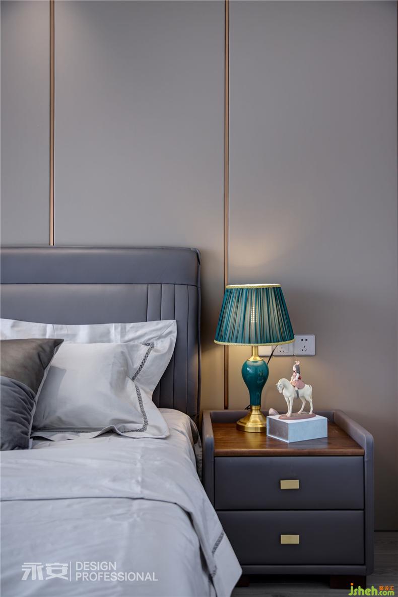 床頭米灰色的護(hù)墻板以黃銅窄框線裝飾,材質(zhì)間的交融與碰撞讓空間彌漫著低奢的情調(diào)