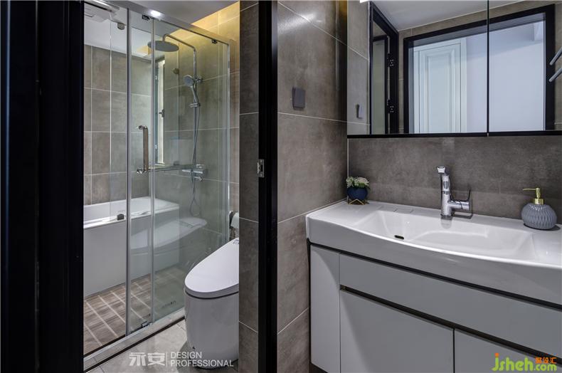 在構(gòu)建衛(wèi)生間時(shí),設(shè)計(jì)師從設(shè)計(jì)的角度將空間的比例關(guān)系、材料本身的美感和區(qū)域功能性相結(jié)合,以實(shí)用性原則詮釋生活美學(xué)。白色的衛(wèi)具與淺褐色的巖板作為的主要視覺(jué)面,玻璃門(mén)以及鐵藝門(mén)框相間其中,讓浴室有了更深的層次感與空間感