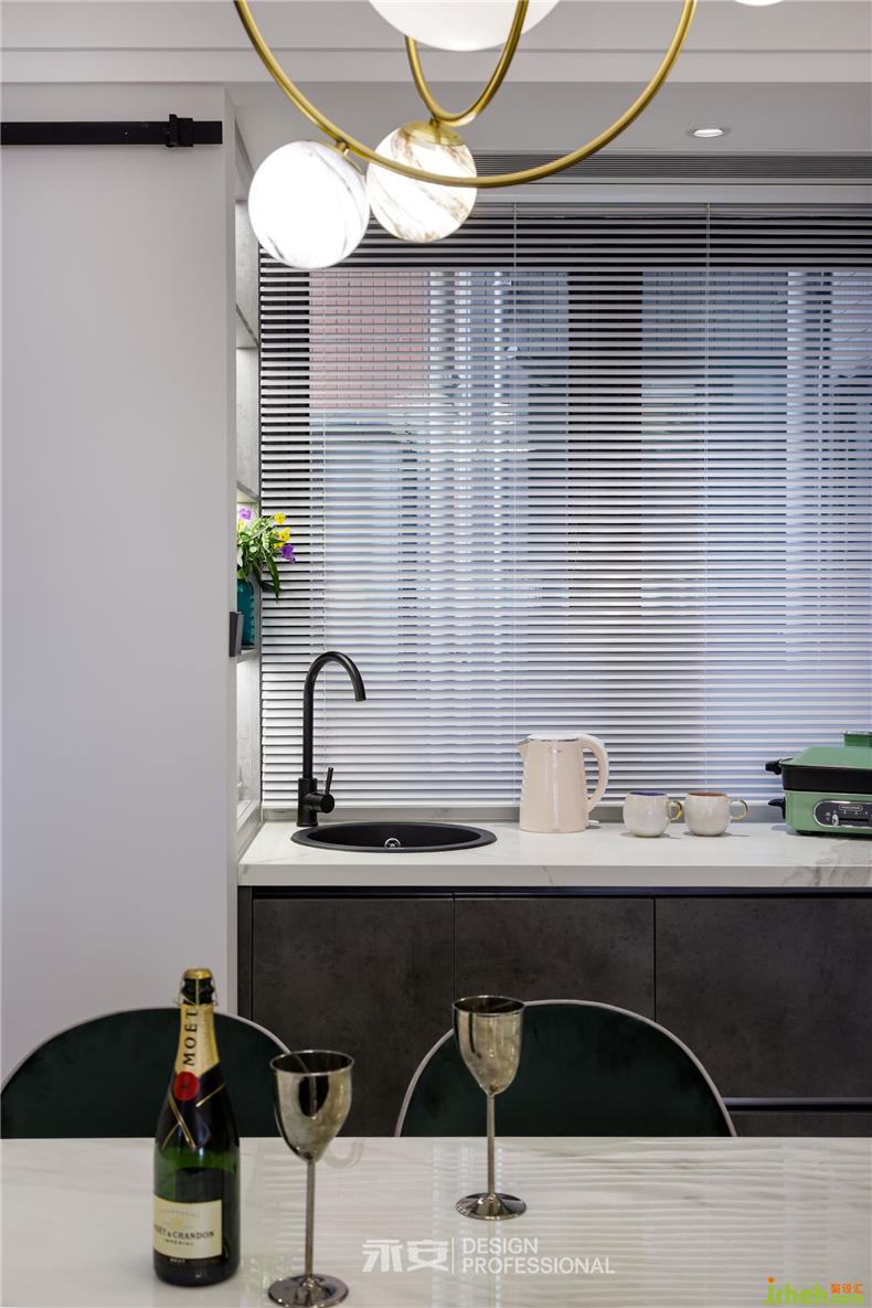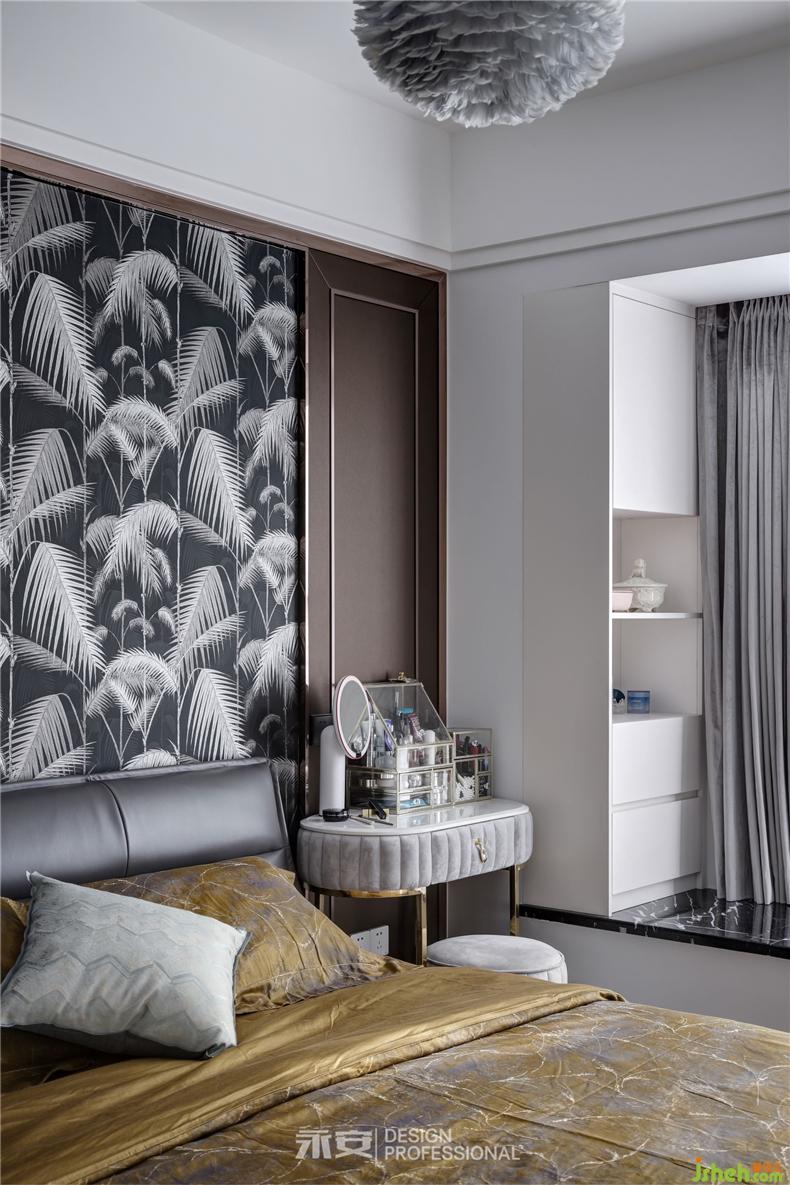 床頭是自然生趣的鳳尾竹巨幅壁畫(huà),搭配兩邊咖啡色的飾面板,加上質(zhì)感十足的黃銅框線進(jìn)行裝點(diǎn),呈現(xiàn)出一種古樸而又精致的美感。在此之下,是暗金色的被單與枕套,奢華而又舒適,善于享受生活的人自然不能在枕頭與被套上委屈自己。吊頂燈的外形猶如一團(tuán)漂浮著的羽毛,打開(kāi)燈時(shí),光線從羽毛間的縫隙中射出,整個(gè)主臥在這一縷縷光線的照耀下熠熠生輝