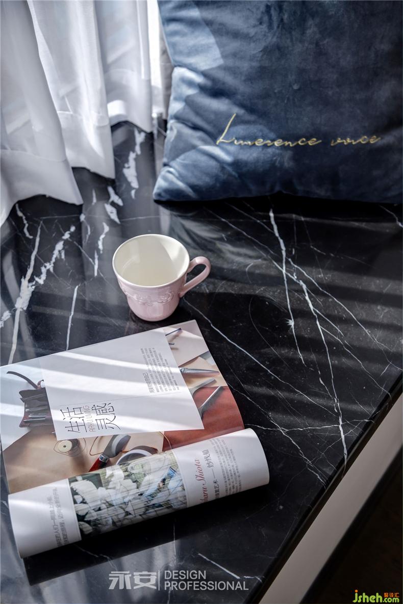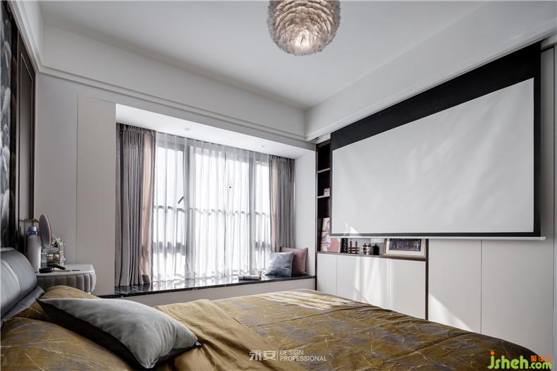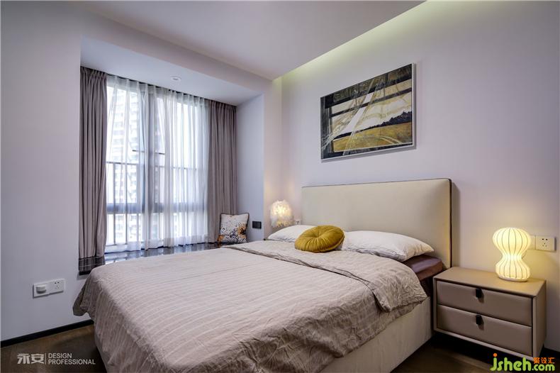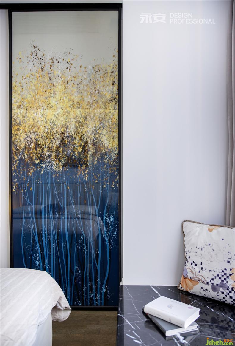 在房間內(nèi)有兩扇飄窗,一扇是視線之窗,另一扇便是床頭的心靈之窗,窗外是黃澄澄的麥田,此時(shí)剛好一陣秋風(fēng)吹過(guò),房間里恐怕已經(jīng)滿是麥香。對(duì)面的床尾,是一幅秋季的森林,從深藍(lán)到淺藍(lán),從金黃到米黃,從下到上,色彩的過(guò)渡,讓人遐想無(wú)窮。這兩幅正在討論著秋天的裝飾畫(huà),便足以令居住者心喜于此
