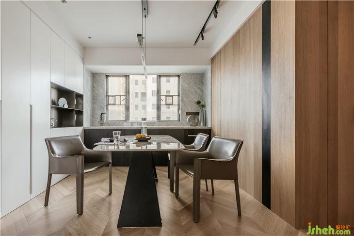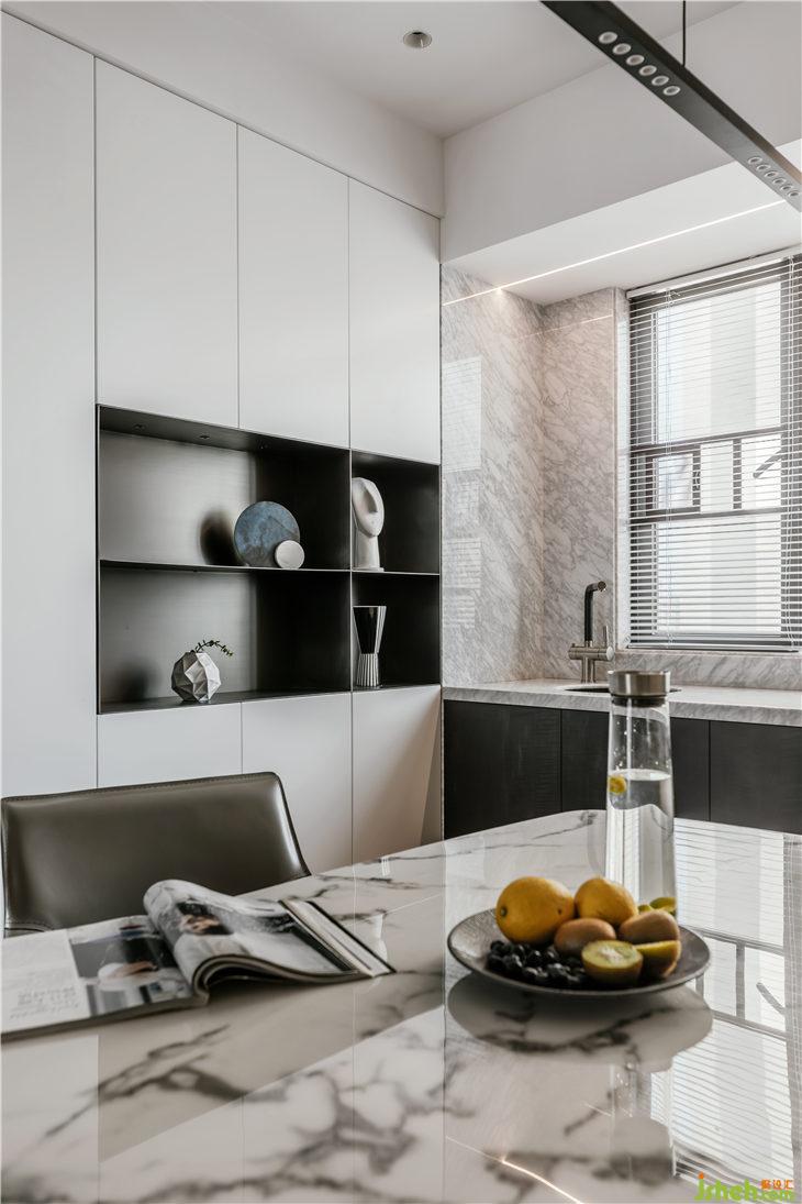 餐廳旁水吧臺的設計,兼顧日常全家人飲水及冷餐操作吧臺的作用,清晨的陽光懶懶的灑進來,笑意盎然。