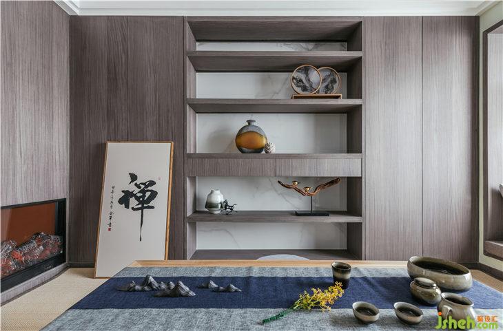 茶室左側(cè)高柜下設(shè)計(jì)內(nèi)嵌LED壁爐,熱烈的火焰在搖擺在燃燒,暖意盎然,營造溫馨氛圍感。