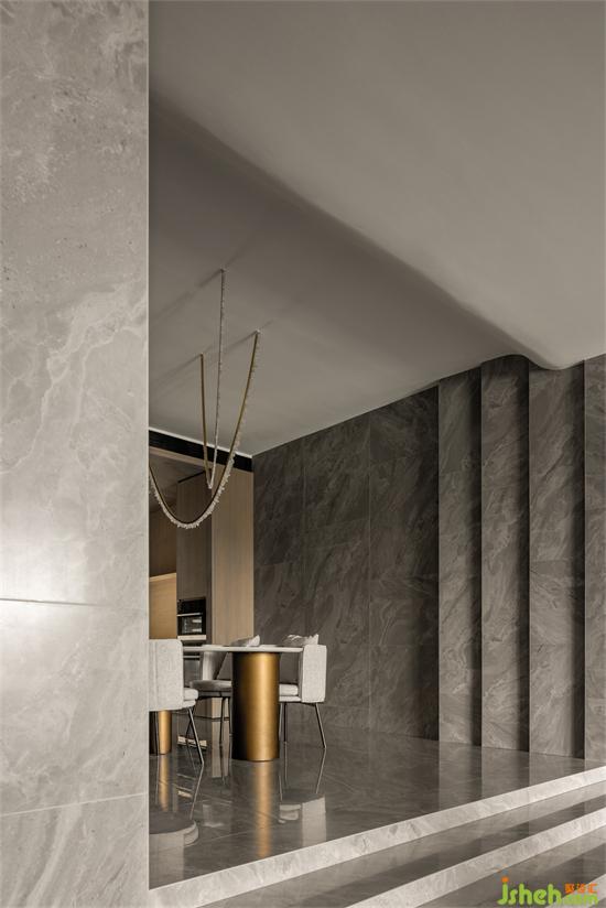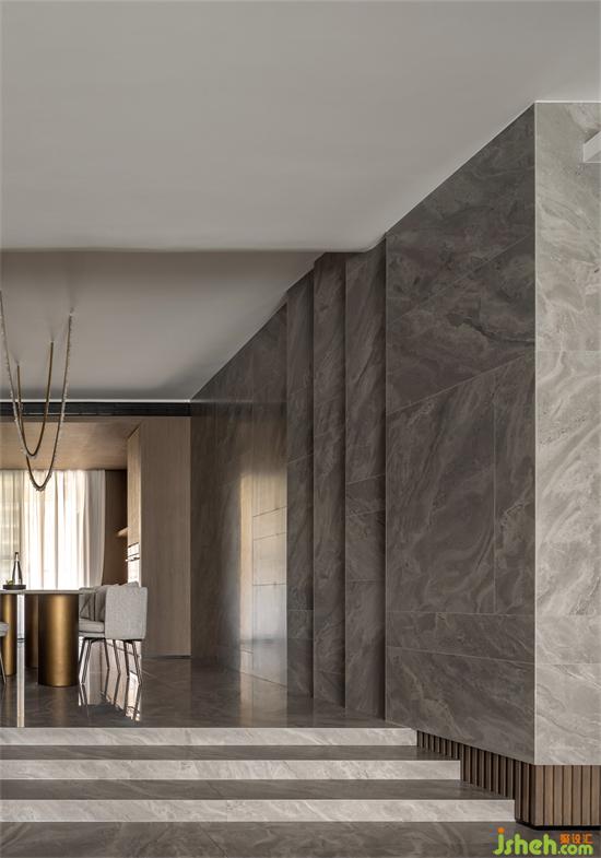 墻面材質(zhì)的鋪陳、延續(xù),通過大量的塊面交錯關系,從視覺和動線感受上,拉長空間的縱深感及開闊感。東江首府家裝設計對空間中的燈光,進行了線條化引導處理,強調(diào)結(jié)合空間光影層次。家裝設計頂部線性燈光帶來空間的延伸感,同時以其極細膩的光感分布。