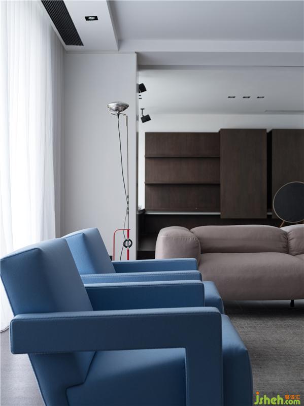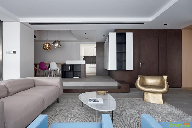 經(jīng)典黑白灰粉飾空間基底,金色造型座椅佇立于客廳之中,遺世獨(dú)立。藍(lán)色單人椅、杏色沙發(fā)增添跳躍色彩,在沉靜的空間氛圍中點(diǎn)起波瀾。室內(nèi)設(shè)計師