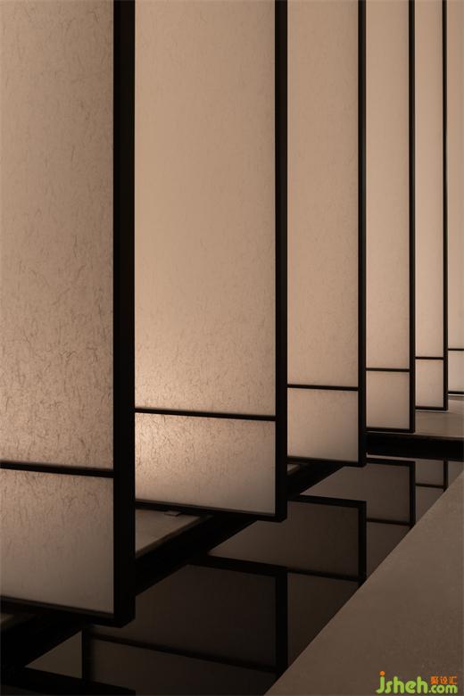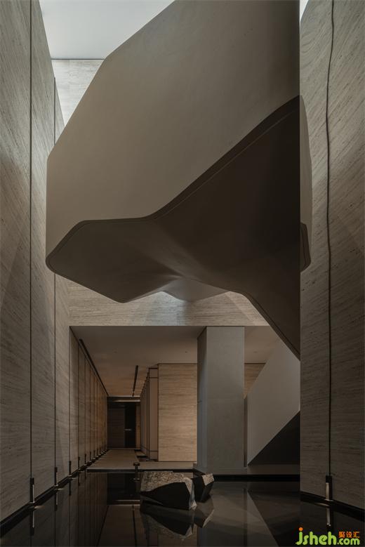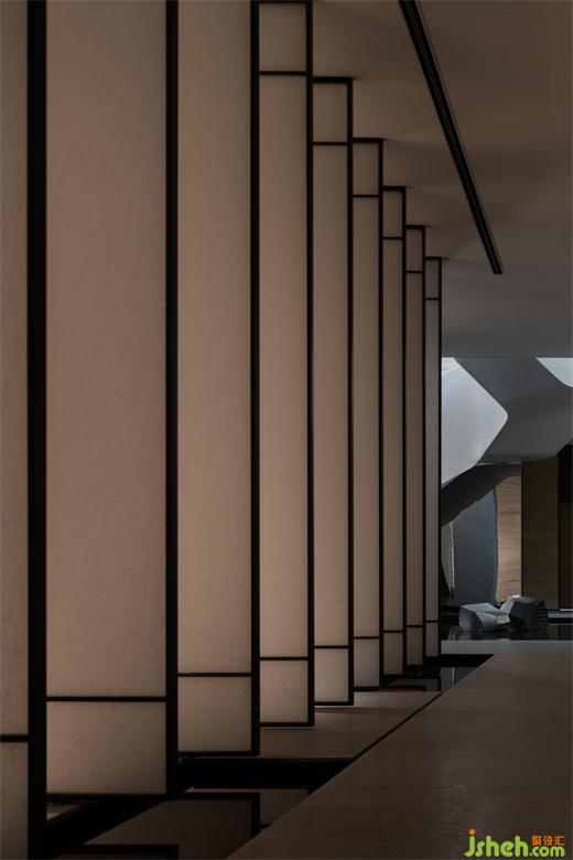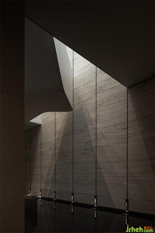 曲折迂回,幽閉與開敞之間戲劇性的轉(zhuǎn)換成為空間的主旋律。行至后場,豁然首見通透玉石,隱示空間轉(zhuǎn)入溫潤高雅之境??臻g的轉(zhuǎn)折變幻,營造出人、空間、環(huán)境之間的互動關(guān)系。幽暗之處,令人專注;而開敞之時,又使人心境豁然開朗,相互襯托,形成對比與和諧的統(tǒng)一。