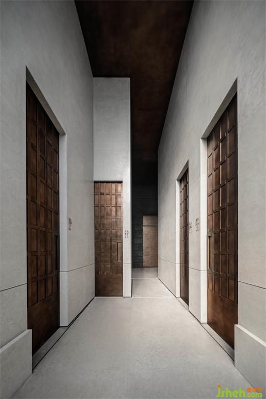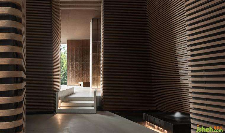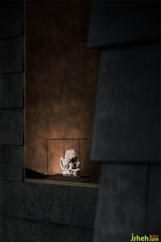 墨色的陶板如自然的瓦片,隱含著山間廬舍的質樸柔和。案牘之上的瓶花清供,折射出插花之人的意趣和性情?!八故锹遥┪岬萝啊?,清雅之物的擺放使東方的審美意境在當下的空間中延續(xù),光線透過VIP室底部的開合縫隙,與庭院之中的蔥翠融為一體,如畫般通透美好。