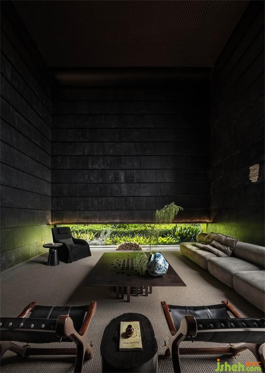 在架空層下,隱匿著一處多功能的空間,為生活方式開辟了諸多可能性。于此,品茗午茶,真正享受那片刻的寧靜與平和。光影在時光流轉中變化無常,豐富的光影交織賦予此地深邃的遐思與溫情。當空間沉靜,時間與生命在其中若隱若現,使得使用者于此尋得情感之寄托。