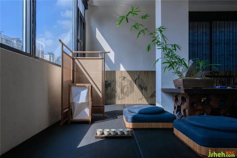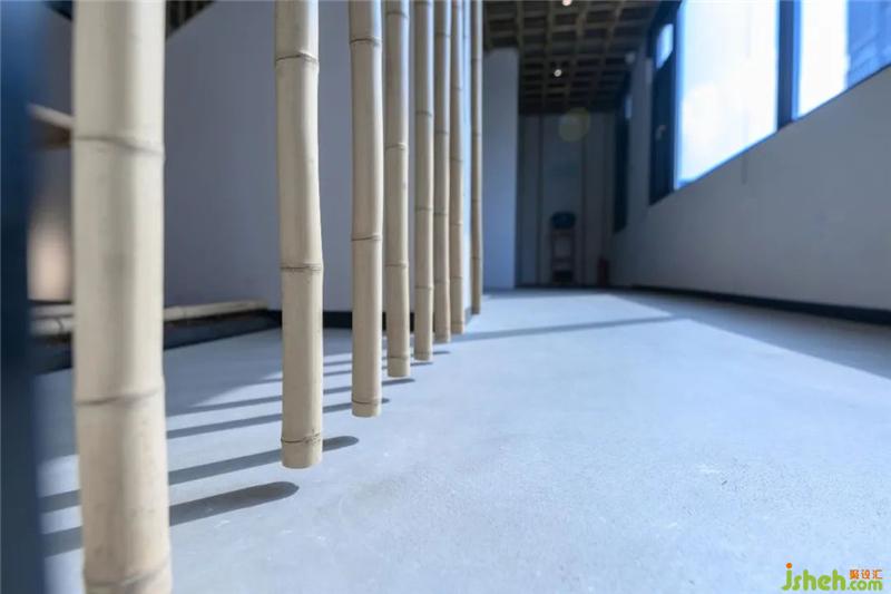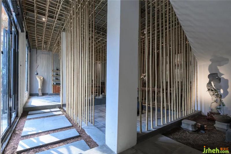 門廳玄關(guān)處,竹簾隔燕。取茶葉鋪于丁步之下,化形于水,增添靈動之感;正廳之內(nèi),竹垂成簾,圍合而成,便是幽篁。在流動與虛幻之間,仿若行走在時光隧道之中,須臾便真的穿越古今。
