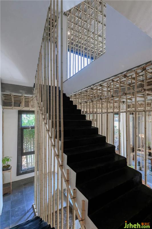 二樓轉(zhuǎn)角處,光影輝映,輔以奇石投照,在翠竹婆娑之下,竟成“清照竹下沉思圖”的小景。