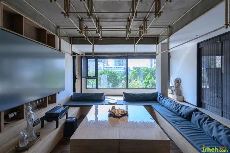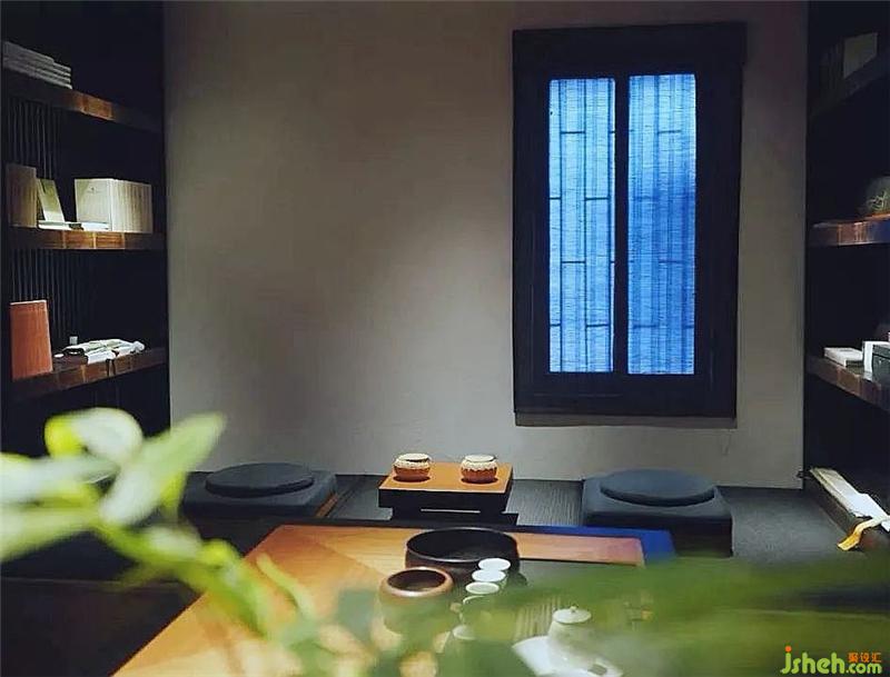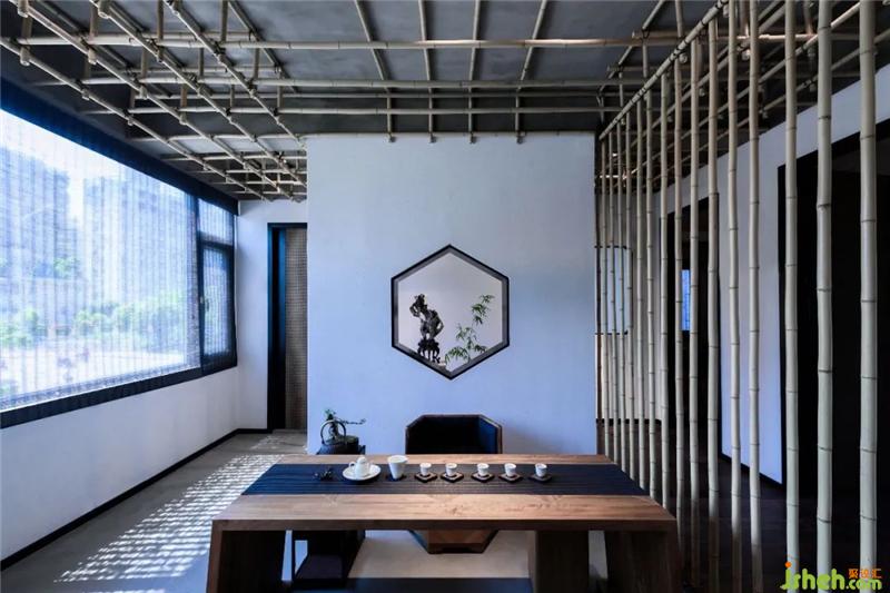 竹簾環(huán)繞,扶梯而上,乃入二樓。墻體、影壁無不遵循古建筑的架構(gòu)方式,并在影壁之上,以蘇式園林中的六邊月窗嵌之,如璞山露出影影玉色,觀之別有洞天,成為這方空間的點(diǎn)睛之筆。窗內(nèi)探出竹影松枝,與白墻窗欞遙相呼應(yīng),成為一道絕妙的背景。行深至內(nèi),竹影墨香環(huán)繞茶室。墨香竹景加以茶韻,疊韻造型如絲如縷意即深遠(yuǎn)惠州室內(nèi)設(shè)計(jì)。