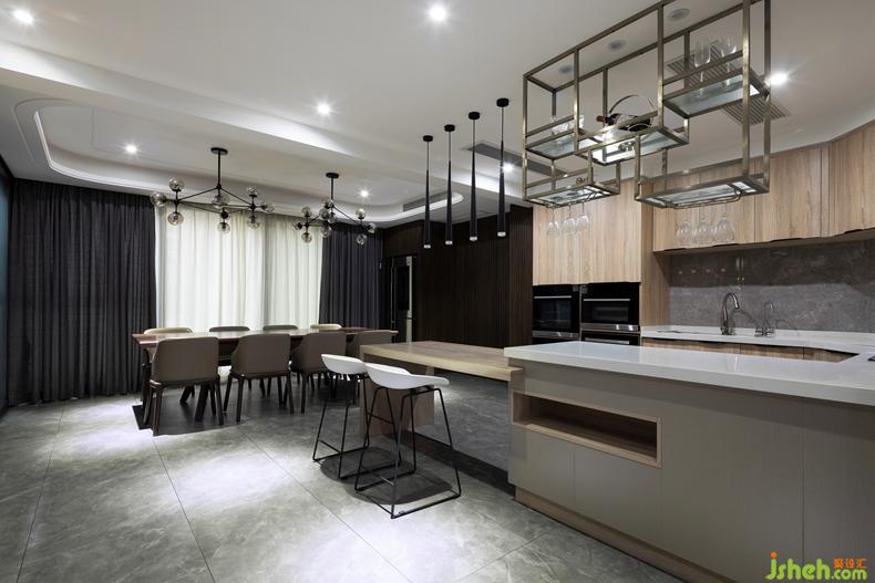 開放式餐廳與客廳相聯(lián),預埋式吊軌窄邊四聯(lián)動門,極大開闊了客廳與餐廳的視野,增強了客、餐廳空間的光線,在不銹鋼與灰玻璃的材質(zhì)里帶來一份溫馨與親切感。也愉悅了從休閑到用餐的整個生活氛圍。