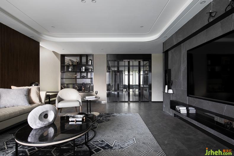 主要材料:尼斯木飾面、黑色拉絲不銹鋼、鋼板、古?;掖罄硎?、雅士白大理石、鐵石、墻布、實木地板、灰鏡。