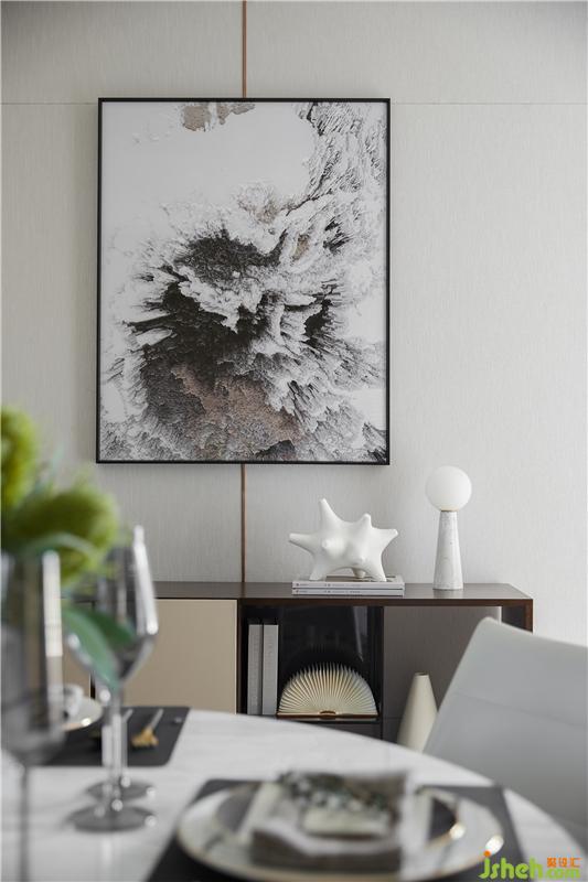 云卷云舒的灰色背景帶給居者高級的藝術(shù)視覺體驗,簡潔而有力的線條游走穿梭在不同材質(zhì)的塊面之間,精致的藝術(shù)飾件在光的催動下彌漫著虛懷若谷的悠遠意境,是媒介,亦是一番錦上添花的點綴。