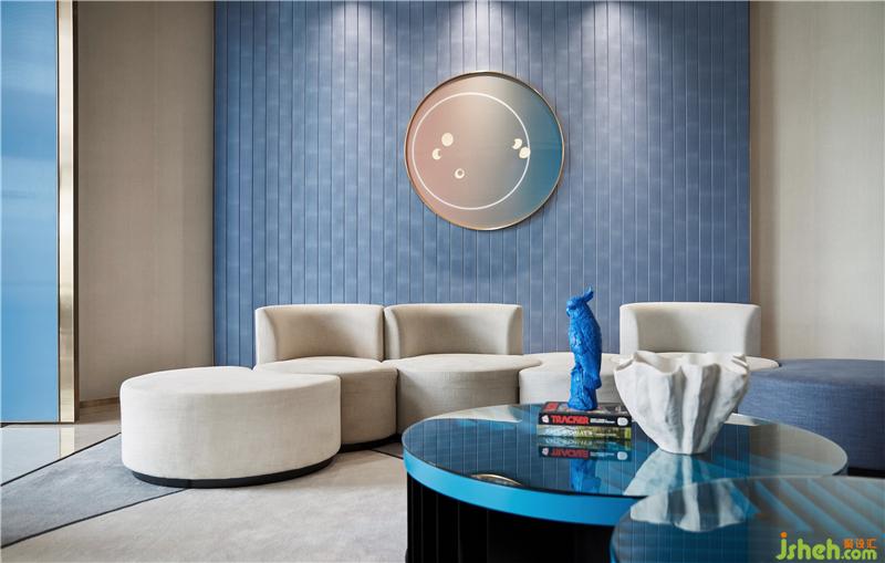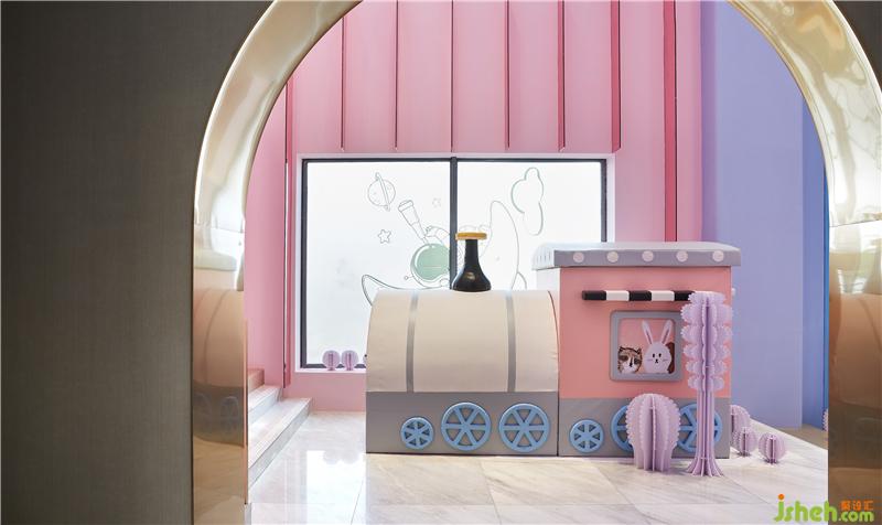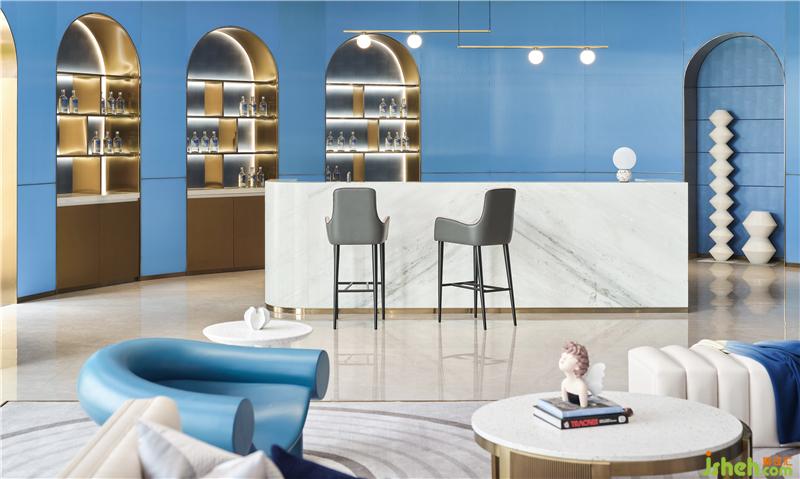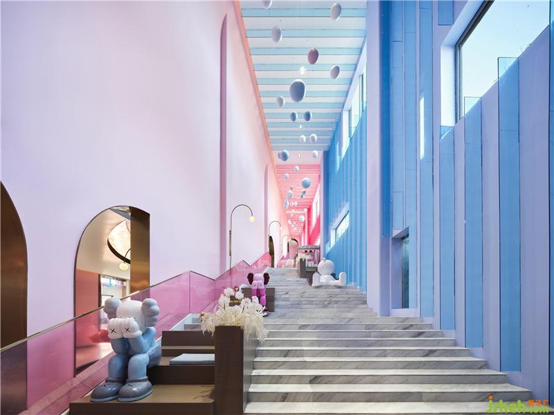 人生好似‘名利場’,設(shè)計師就如這場戲中的造夢師。情感是空間設(shè)計中最重要的元素,洽談區(qū)域藍(lán)色與粉色的塊面穿插,如同打翻了馬卡龍的顏料盤,蘊(yùn)含著沉浸心靈的精神力量。
