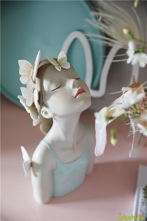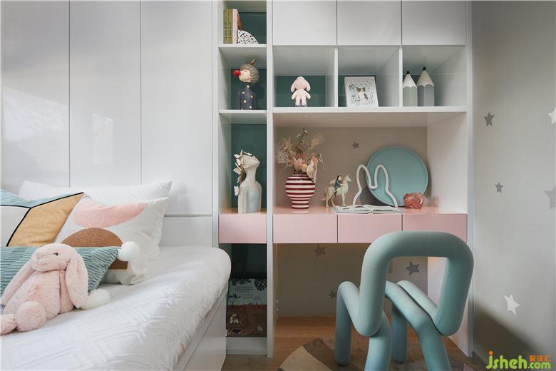 造型奇特的靠椅,可愛(ài)趣味的書立,豐富多樣的擺件,滿墻的星星讓人仿佛墜入童話世界。桌上的小女孩仰頭合眸宛若精靈,蝴蝶依偎于身旁,他們吟唱著夜色,吟唱著綠色的夢(mèng)。