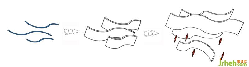 依托于自然而來,設計取“自然”之勢,河流代表了水的流動性,動態(tài)代表著人類的身影。交融碰撞中,可隱約一瞥江面碧水煙波裊裊的空間畫卷。