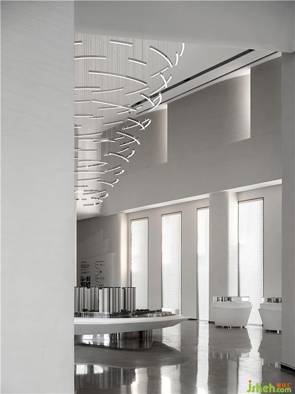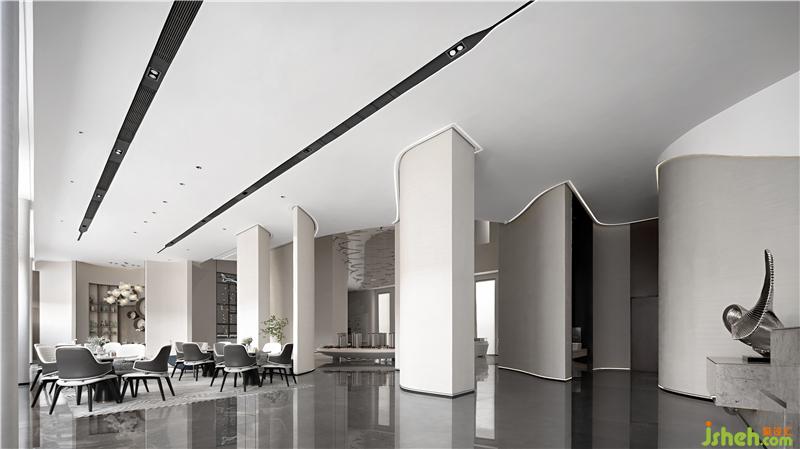 接待前廳,幾段曲線,寥寥幾筆繪盡漢水迸流的寫意之美,意象與自然并肩偕行。深厚的人文與線條的靈動如浪濤般綿延,素雅無邊卻又風雅自成。