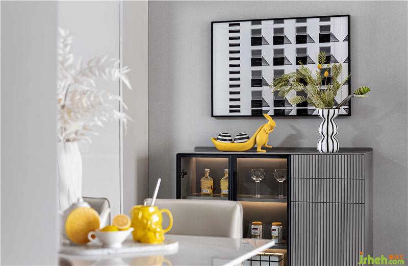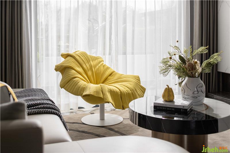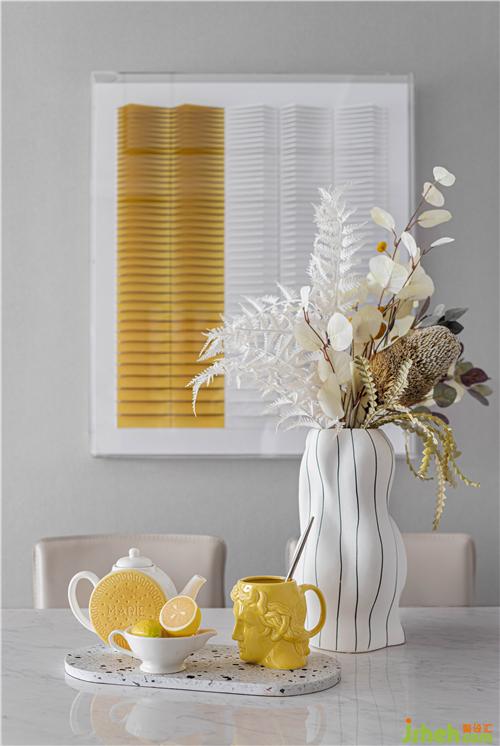 客餐廳空間中,沉靜而不失活力的黃色在客廳空間中有序穿插,喚醒人們對(duì)生活的熱情;單椅、沙發(fā)靠墊形態(tài)各異,富有張力。波點(diǎn)和線條的穿插,將藝術(shù)化的審美意涵發(fā)散至空間的每一處。