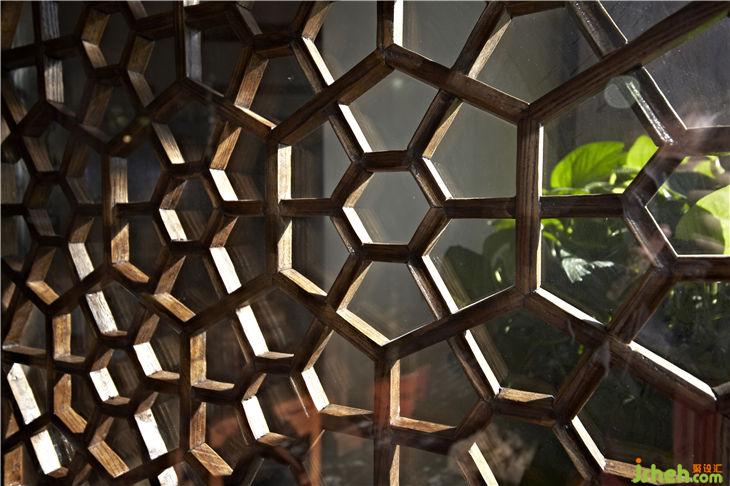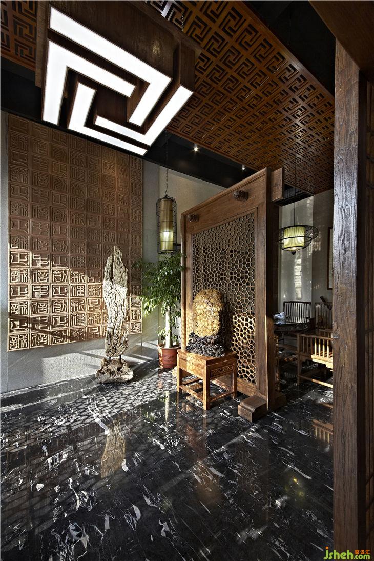門面以酸洗成凹凸亞光深灰色的天然中國黑花崗巖石與厚實(shí)自然的榆木為材料,整體穩(wěn)重而古樸;雙扇頂天立地傳統(tǒng)紋樣的木格門扇配上青銅門環(huán)極具沖擊力,讓人感受到中國傳統(tǒng)裝飾的力量,引發(fā)人們懷舊情愫,歷史瑰寶與儒雅文化蘊(yùn)含其中,東方神韻盡顯;大門兩側(cè)的全玻璃門在古式立柱的烘襯下更顯現(xiàn)代與古老的融合,是中華文化歷史內(nèi)涵與現(xiàn)代時(shí)尚生活相互交融。
