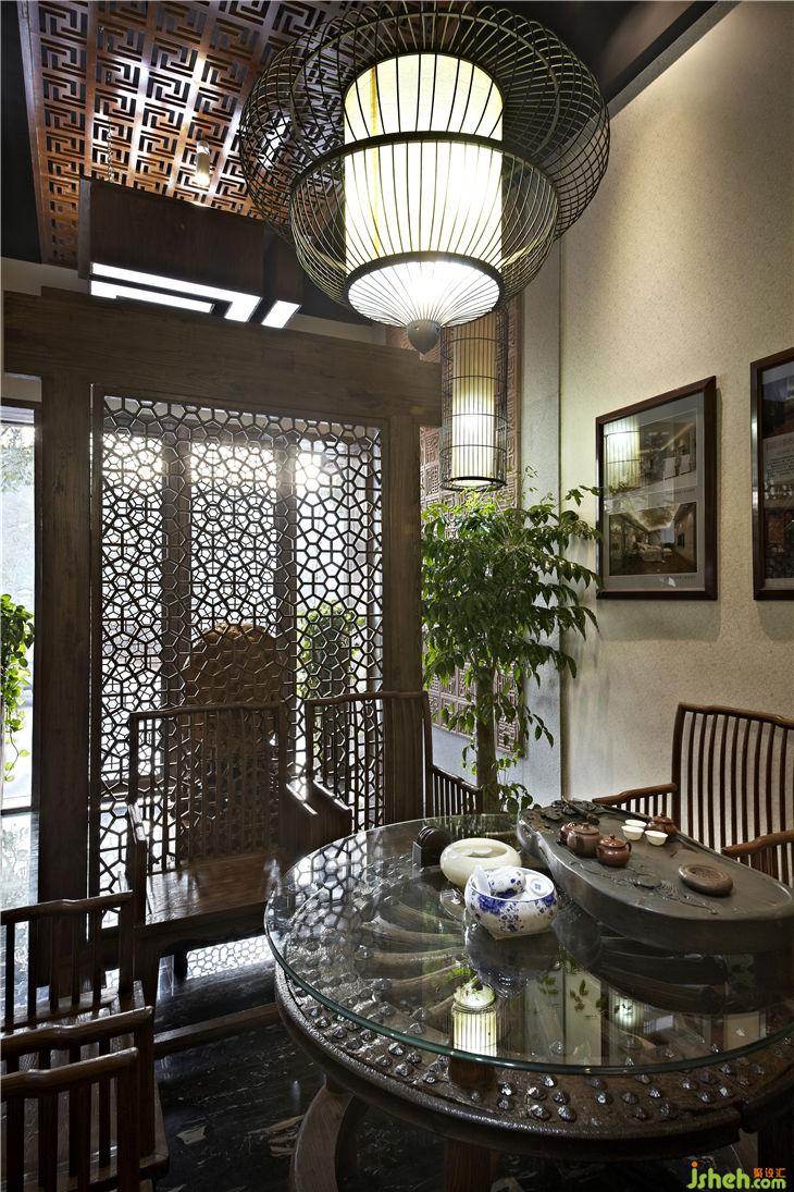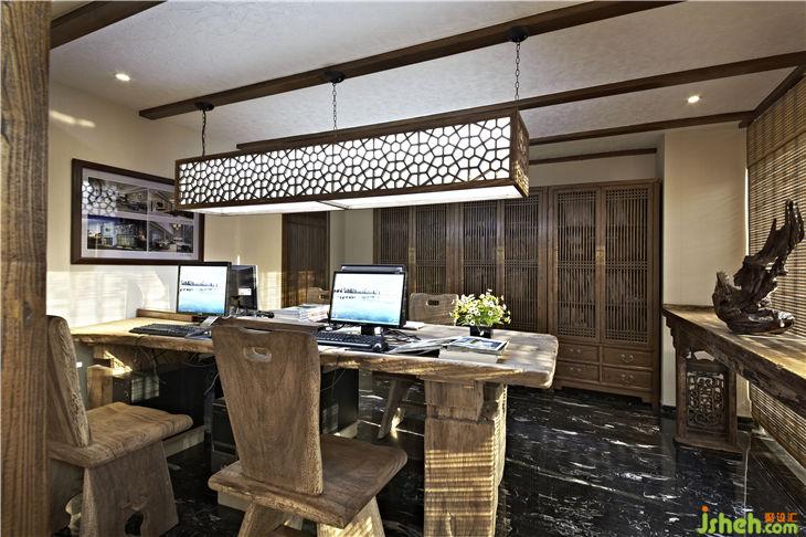 榆木屏風后是接待區(qū),品茗圓桌是古老馬車輪改造而成,失去原來價值的馬車輪恰到好處的找到它的棲息地,靜靜地訴說歷史的變遷和歲月的悠久;純自然的樹干工作案臺,不加任何修飾、雕琢,流露出木質(zhì)自然的本色,樹皮的凹凸及自然肌理毫無掩飾的展示,宛如素面美人的清純和輕盈,把設計語言還原到最原始的純粹和簡潔。落地玻璃窗戶掛著竹簾,陽光透過竹簾縫落在玻璃窗下古老的案幾上,青翠的綠蘿、典雅的青花瓶,似乎在相互傾訴!歲月無聲,而古老的設計語言、設計元素還在延續(xù),還在體驗……