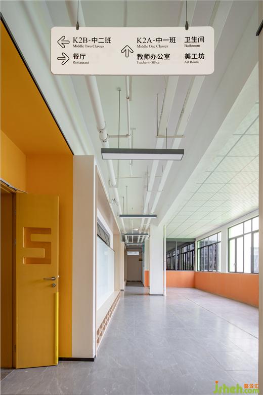 墻壁和防火門(mén)刷成橘黃色,讓空間的劃分更有辨識(shí)度,孩童更好的找到自己的班級(jí)。走廊的墻壁漆成半上墻的橘色,與門(mén)廳的色彩相呼應(yīng),讓整個(gè)空間富有變化,更有層次感。