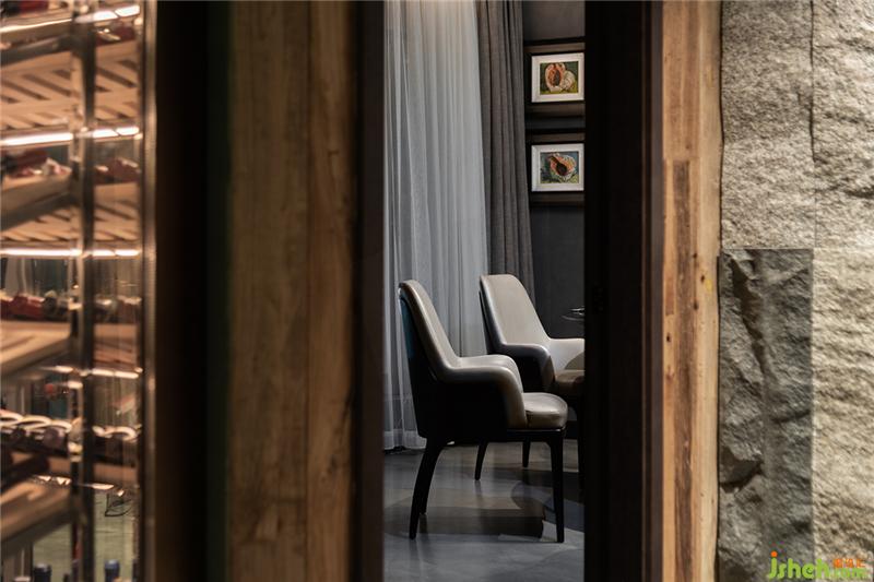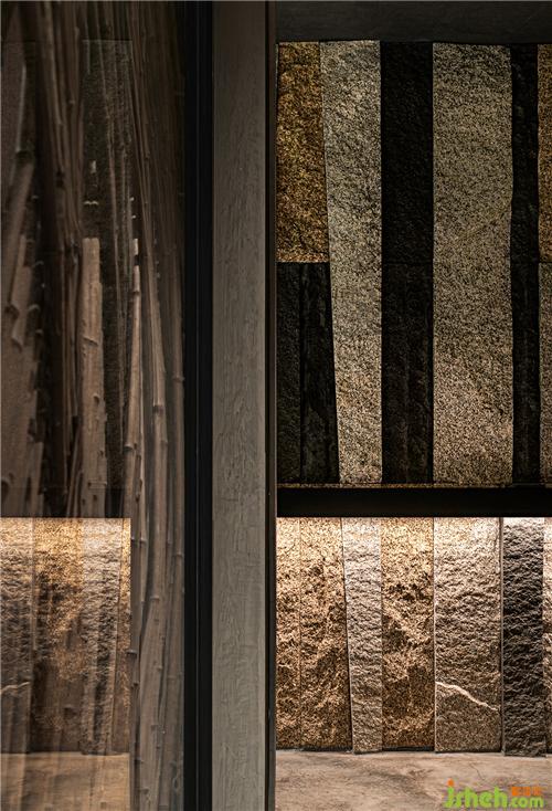 不同色彩的青石板同樣完全保留原始狀態(tài),但通過切割和重新組合得到縱向拼接的整個墻面,它們向上延伸拉長視線,山石自然風貌呼之欲出。