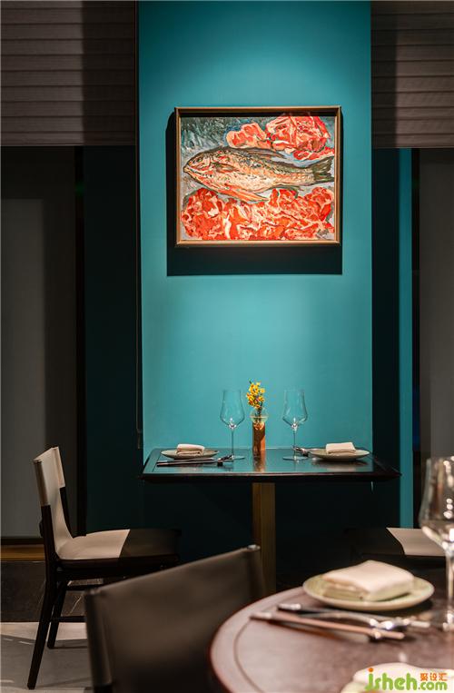與之相對應(yīng)的,是靠窗一側(cè)清爽的孔雀藍,在沖撞里帶來年輕的自由感和愜意,鏡面吊頂將空間映入湖水般的波紋里,視線向高處伸展,北京餐廳設(shè)計可能的狹小空間感受立刻消散。餐桌椅材質(zhì)色彩大氣質(zhì)樸,但在造型上趨向輕盈舒適,無論從任何角度都在確保品質(zhì)的前提下?lián)肀晨?,而非形成距離感。