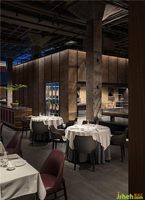 柱網(wǎng)間距5.6米35根立柱撐起原建筑空間,單層凈空高度達(dá)到5.8米。規(guī)整空間、良好通風(fēng)和衛(wèi)生條件是原建筑的天然優(yōu)勢,北京餐飲設(shè)計(jì)巨大的四角柱帽與蜂窩屋面成為建筑內(nèi)部的強(qiáng)符號(hào)特征。與此同時(shí),新餐飲空間對(duì)坪效提升的需求也不得不被納入設(shè)計(jì)考量。