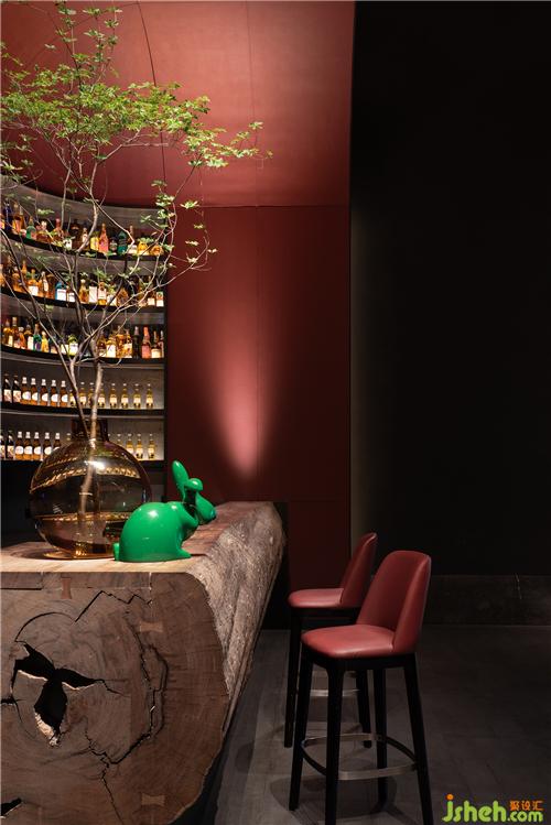 紅色吧臺區(qū)構(gòu)建出另外一個場景——5.2米高的紅色立面向上延伸、彎曲成弧形頂面與建筑結(jié)構(gòu)相接形成灰色水泥盒子中一個嵌套的模塊,古老京城似乎正從這一隅慢慢醒來,被注入鮮活涌動的生命力。