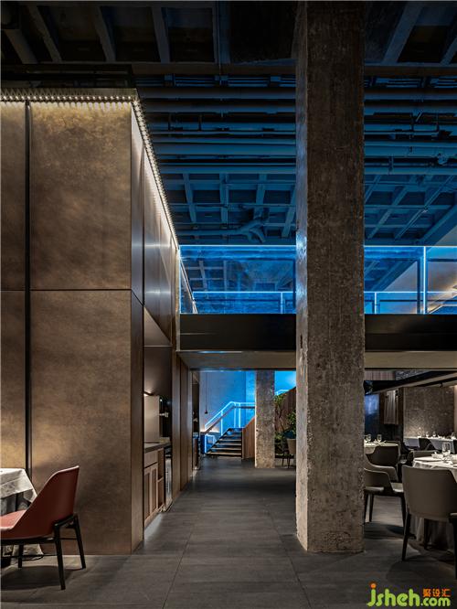 進(jìn)入晚餐時段,大面積渲染的藍(lán)色燈光從天花及部分墻面“溢出”,如同數(shù)字化的夜晚天光。當(dāng)代設(shè)計(jì)手法、傳統(tǒng)地域文化與舊建筑符號交匯成動態(tài)的時間線,和進(jìn)入空間的每個人發(fā)生交互。