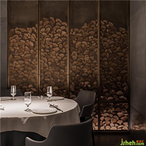 在無限質(zhì)樸,貼近自然的底色上,以藝術(shù)手法、材料、燈光“施金措彩”是讓整個(gè)餐廳空間獨(dú)樹一幟的巧妙手法。