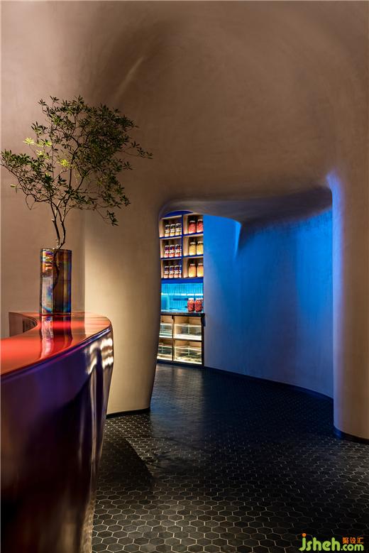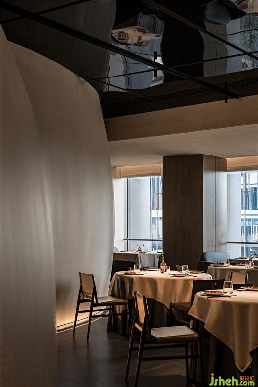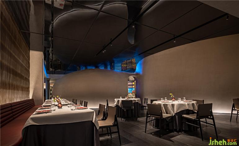 在相對緊湊的內(nèi)部,腔體結(jié)構(gòu)一方面將空間二次分隔,餐廳設(shè)計(jì)創(chuàng)造了內(nèi)部的內(nèi)部,另一方面作為開放區(qū)的雕塑景觀與視覺焦點(diǎn),高效破解了空間和視覺的雙重議題。
