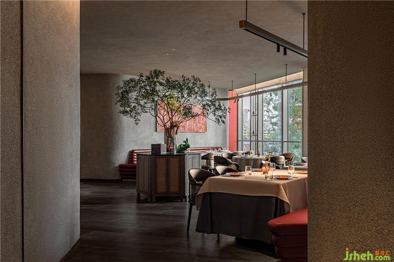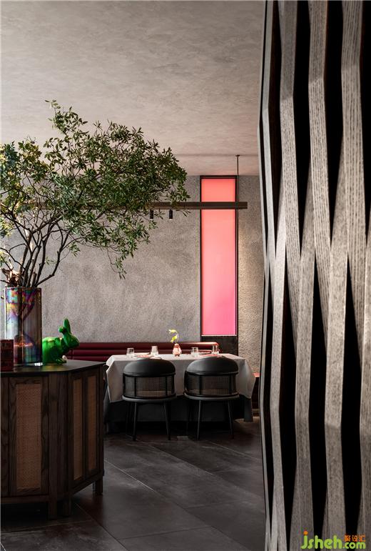 餐廳設(shè)計(jì)更大尺度上——素色大塊面以柔和的曲線將就餐區(qū)圍攏在當(dāng)代氛圍里;三角形木飾面錯(cuò)落拼貼,構(gòu)成“編織”視效,與中心腔體表面的編織鏤空彼此呼應(yīng)、點(diǎn)題。