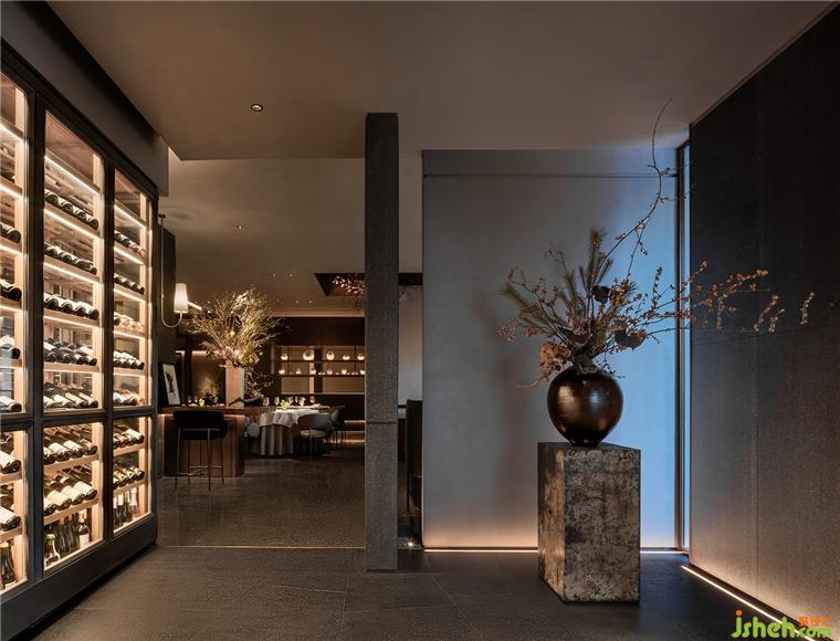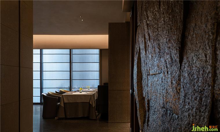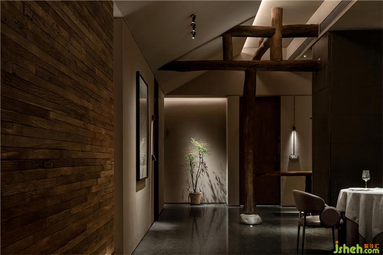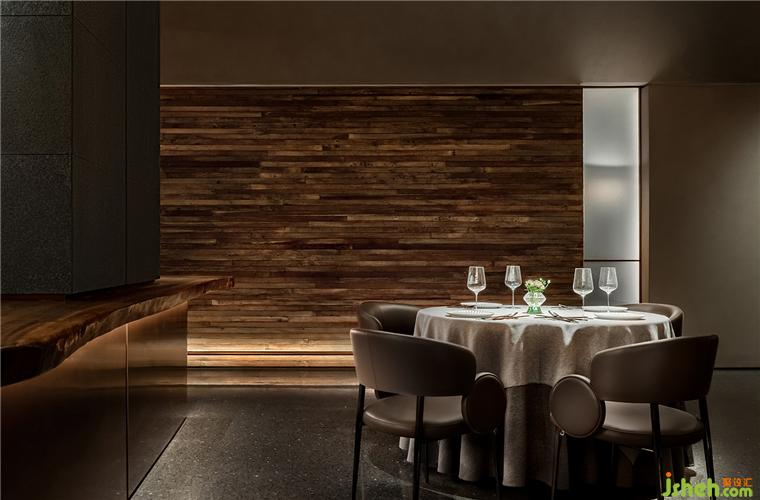 劈鑿厚重的山石立面和紋路深刻的老木板粗獷地勾勒了臺(tái)州開闊的山海精神;禾苑餐廳設(shè)計(jì)混合著蝕刻黃銅、斑駁灰磚、大理石、舊木板的空間將古老的江南民居疊映在上海之上;石墩木柱曾撐起沿革千百年的古老建筑,在新城市發(fā)展的風(fēng)云際會(huì)中漸漸隱入歷史的煙塵,在簡潔素然的現(xiàn)代底色前驚鴻一現(xiàn);城市華燈初上,東方和西方在同一底色中彼此相容。