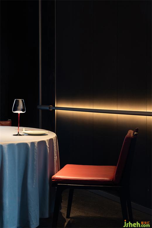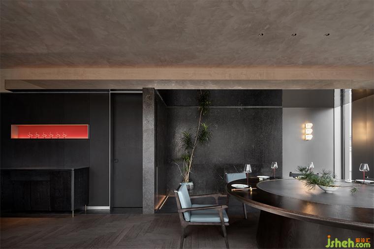 扶梯一側使用傳統(tǒng)天青色,如宋畫中一行流水以當代的力道貫穿垂直空間。山石、畫屏、透光石做角落點綴,傳統(tǒng)意向成為當代空間偶爾的駐足和回望,火鍋餐廳設計對比重力度的把控也是設計在詮釋當代空間時的重要考量。
