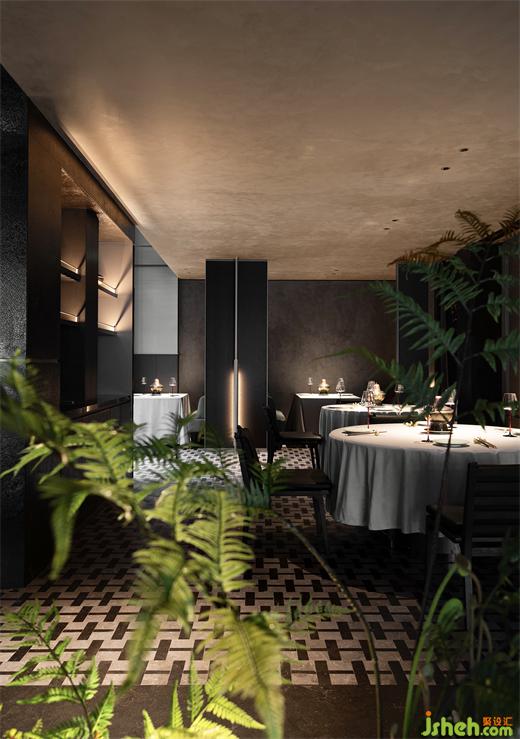 古人講究銅鍋炭火,銅是紫銅,炭是梨木碳,涮出的肉都帶著梨木香氣,更有豪華版銅鍋外表采用景泰藍工藝??紤]到環(huán)境等因素,現(xiàn)代銅鍋已不再用碳,京π保留了景泰藍銅鍋,炭火的傳統(tǒng)則引申為空間內(nèi)大面積使用的炭化木,紋理富于變化、肌理自然粗糲的炭化木與銅板、金屬板穿插,調動出空間穩(wěn)而不重、古今共筑的質感。