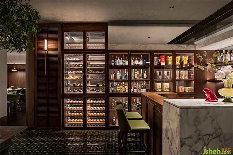 鮮活肉檔、食材展架、酒窖吧臺在入口儼然營造出生動考究的煙火場景。隨著轉(zhuǎn)過酒柜進入散座區(qū),空間收緊又忽而敞開,進入前的喧囂如泡沫在身后破碎了。散座區(qū)寬敞完整,充分的開放性并不傷害功能,寬大的多功能臺恰好使走廊和就餐區(qū)分隔,一動一靜、一古一今,交錯并行,使餐廳也有了博物游觀的樂趣。