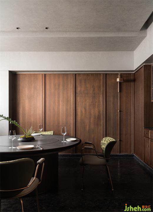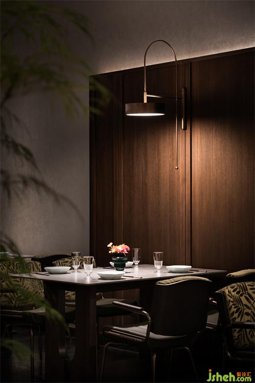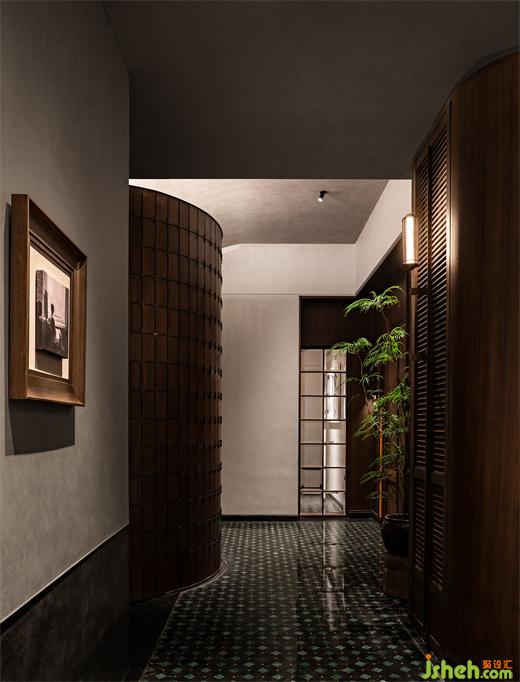 沿花磚廊道至包房區(qū),木飾面包覆的半圓結構柱陡然打破平直的空間,婉轉的流動性將客人吸引至更深處的空間?;疱佋O計空間曲率的一點變化像畫師腕力一轉,畫中鳥獸隨即靈態(tài)必現(xiàn)。角線片段式地編織進天花結構,低調不失輕巧地致意古典。人們總對起伏跌宕的敘事著迷,空間亦如是,在變化的韻律里,煙火趣味生生不息。