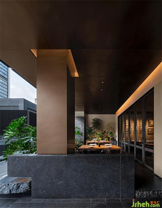 犧牲掉室內(nèi)部分面積后,云南菜餐廳設(shè)計(jì)師成功創(chuàng)造出一個(gè)安靜的與戶外連接的內(nèi)庭院,散座區(qū)流暢地過(guò)度到自然光和戶外環(huán)境中,所有室內(nèi)陳舊的、低垂的、粗糲的都從這個(gè)出口涌入天光中,然后成為炫目的、高昂的、細(xì)膩的一部分,與城市再度相融。這個(gè)小小的園林意向的區(qū)域也作為餐廳的精神內(nèi)核,生息在人們對(duì)古意和自然的回望向往中。