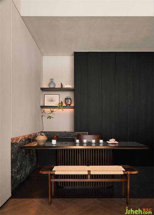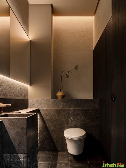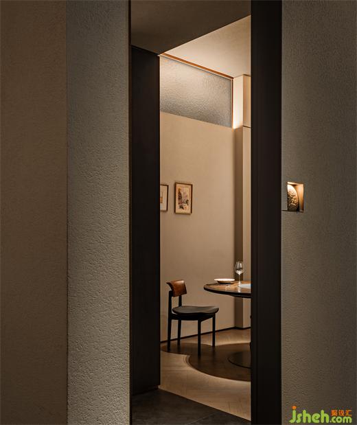 沿走廊至包房,石板磚附著一層油潤的薄光,漫漫層疊的黃土是視線盡頭的地理造像。枝形黃銅把手后,包房像一段上揚的樂章作為空間的終段。潔凈的材料幾乎不飾一物,在靜定樸拙的背景下,天光和城市從落地窗中疊映進室內,組成了一個完整的新世界。