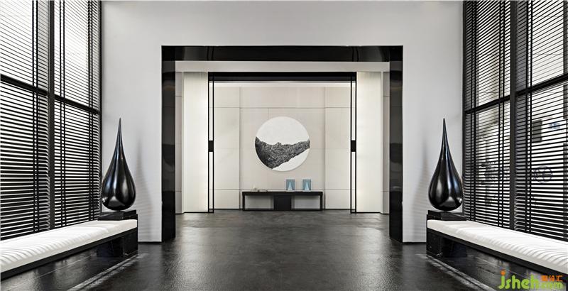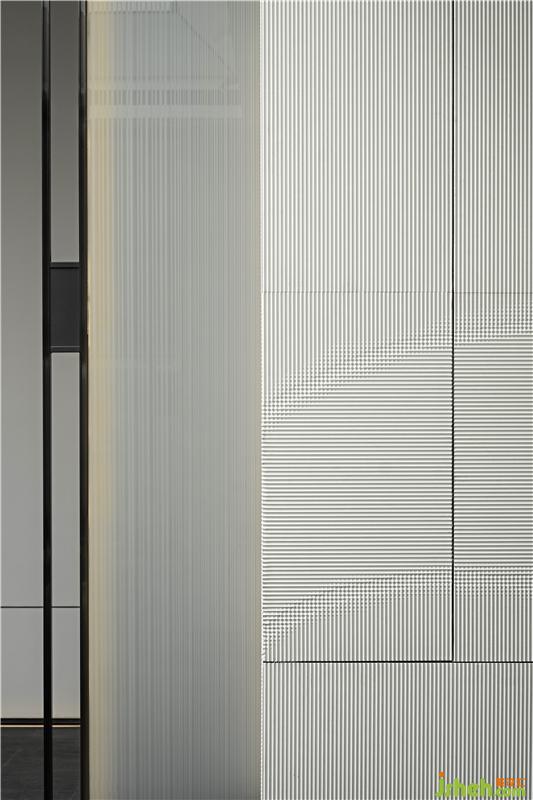 墨者,無(wú)色,亦五色也。入口處橫疊著的石臺(tái),以濃墨潤(rùn)之,漾開(kāi),有褶皺,有起伏,有顯有藏。走近一些,可見(jiàn)墨紋、漣漪,絲絲縷動(dòng),似乎要更淺些,如淡墨般,此番便為知黑。大面積的墻體守白作為墨之五色中的“清”來(lái)對(duì)待,只余一些隱約漾著的墨影。胡桃木和暖光燈的穿插平衡了空間中濃與清之間的體驗(yàn)感。