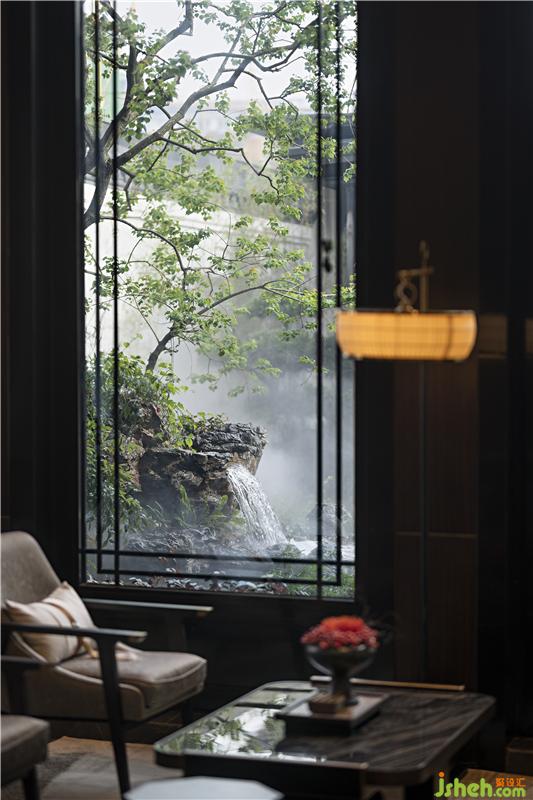 在空間的處理上,盡處造景的手法被運用到了極致,框景氤氳,呈現(xiàn)出恰如其分的藝術魅力。窗外自然景色流轉著,與室內氣韻繾綣相融。室內的有限空間由此得以無限延伸開來,與自然渾然一體。消弭了的空間界限,使其不受實體建筑結構的約束,室內外生命的自由融合,正是儒門中天人合一的哲思之智的體現(xiàn)。