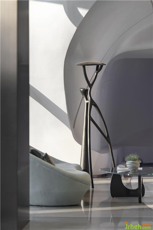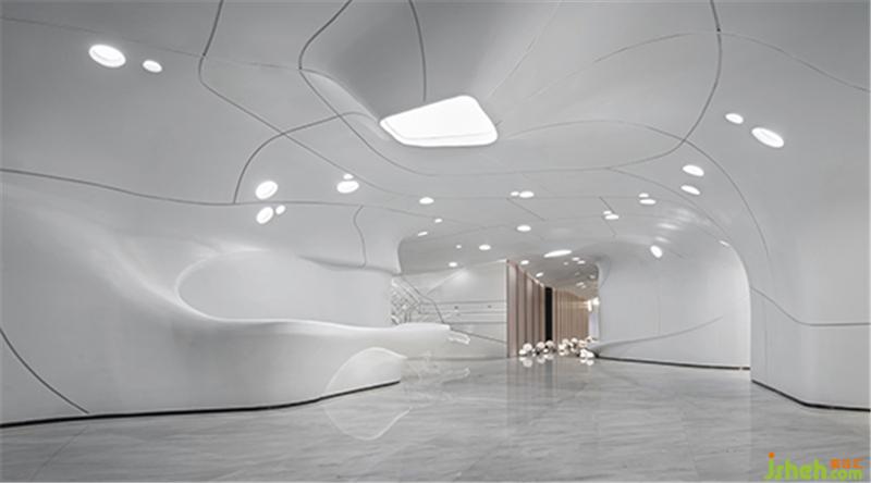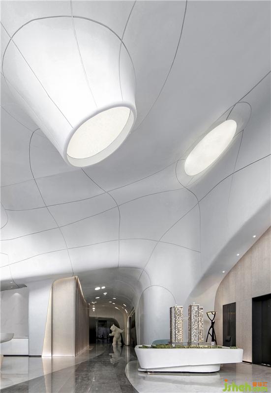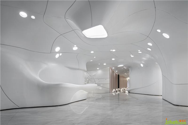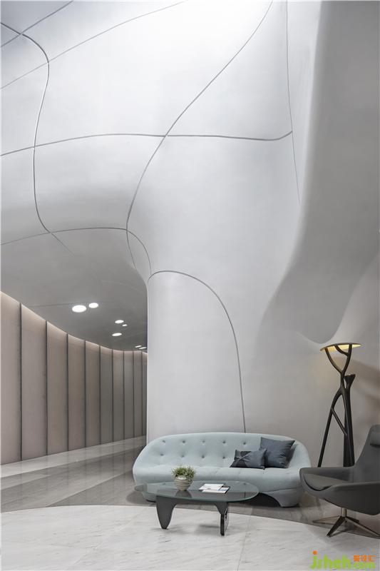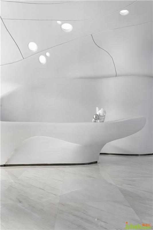 在材料的運(yùn)用上,一如既往的盡可能克制著,彎曲的表面由輕盈型材料構(gòu)成,令空間生出無限種可能性,如同從縹緲間蜿蜒而來的水流、神秘的彌漫在半空之中,營造出極具未來感的場(chǎng)所精神與空間氣質(zhì)。無限延展而去的曲線予人視覺上的永續(xù)感,呈現(xiàn)出“少即是多”的平衡美感,減少不必要的材料消耗后,只余下本色充盈其間,領(lǐng)悟?qū)W⒌拿利?。在原始的純白中,我們卻預(yù)見一世斑斕的未來。
