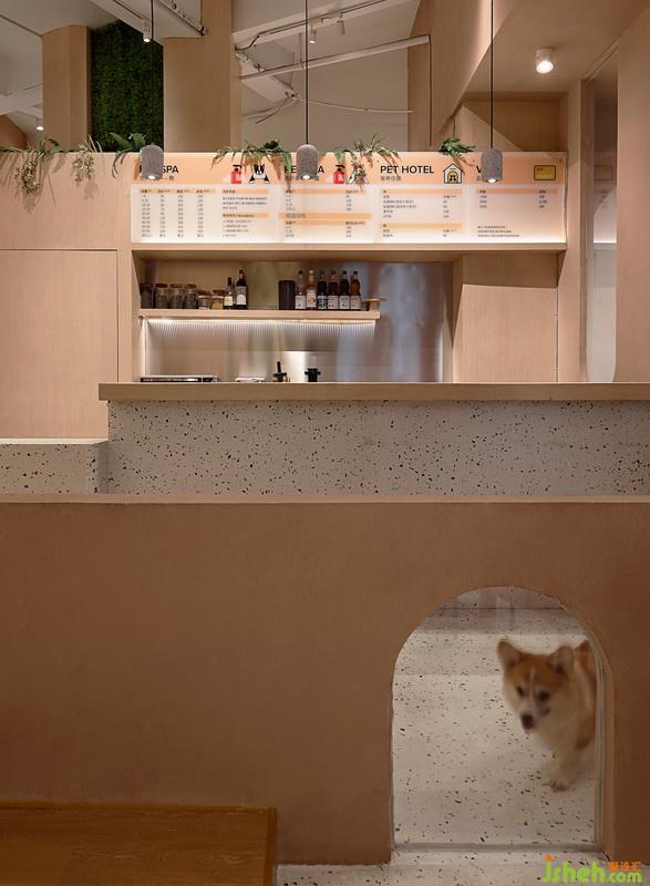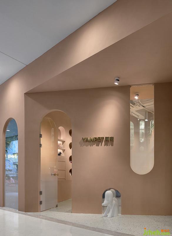 為了打破原先呆板的空間,我們將入口旋轉(zhuǎn)了90°,且內(nèi)退一部分空間使入口對應(yīng)著真正的客流主入口,因?yàn)榈赇佄恢锰幱谔旖趾蛢?nèi)部商鋪通道的三向交匯處,如此并解決了原先店鋪如何吸睛的問題,也解決了雙向客流動線的問題(因?yàn)轭亴檭?nèi)部有3條客流主動線,一是主門進(jìn)入的寵物派對活動區(qū),二是次門進(jìn)入通往一樓寵物美容區(qū)的動線,三是次門進(jìn)入通往二樓的寵物寄養(yǎng)區(qū)。)