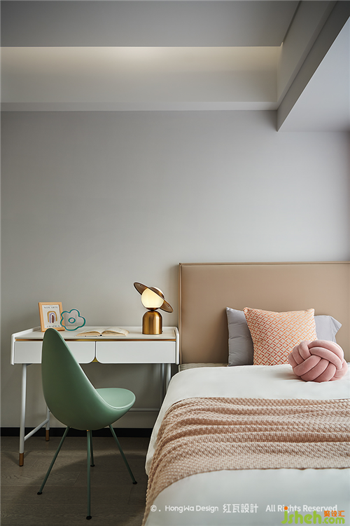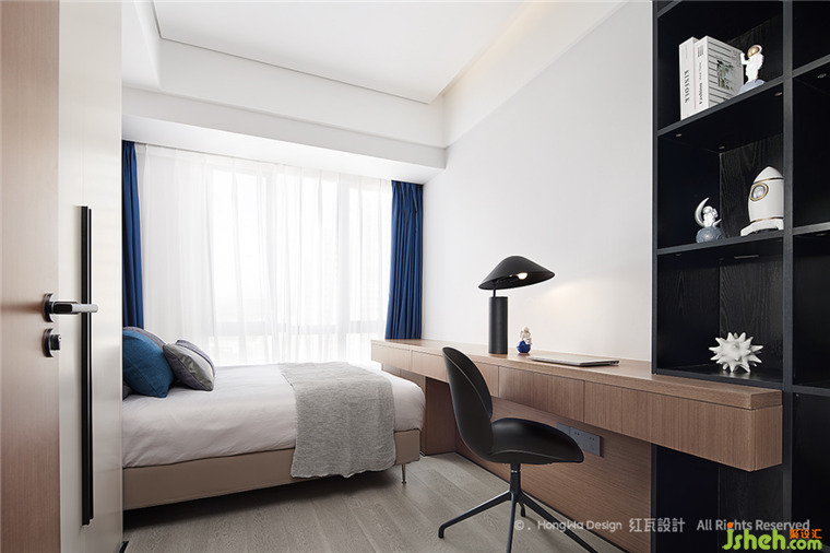男孩房的布置更多是跟隨興趣,這是一個(gè)五六歲男孩的臥室,天生愛(ài)探索,向往科技,所以我們用了火箭、太空人等擺件,藍(lán)色的窗簾,抱枕以及整個(gè)空間,都顯得比較冷靜,可以在其中自在的思考