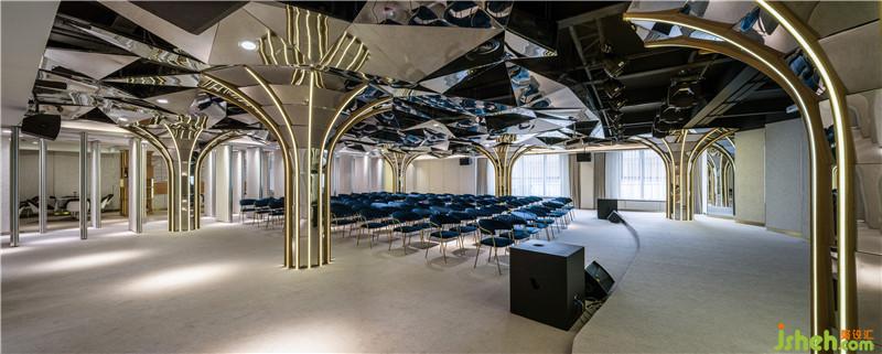 3. 主廳的設(shè)計,「桃源定在深處」,以6根線條優(yōu)雅的光柱,撐起危石概念的鏡面天花板,延續(xù)詩句「危石纔通鳥道」的概念,采用大量自然光的節(jié)能設(shè)計,并利用鏡面反射燈光。